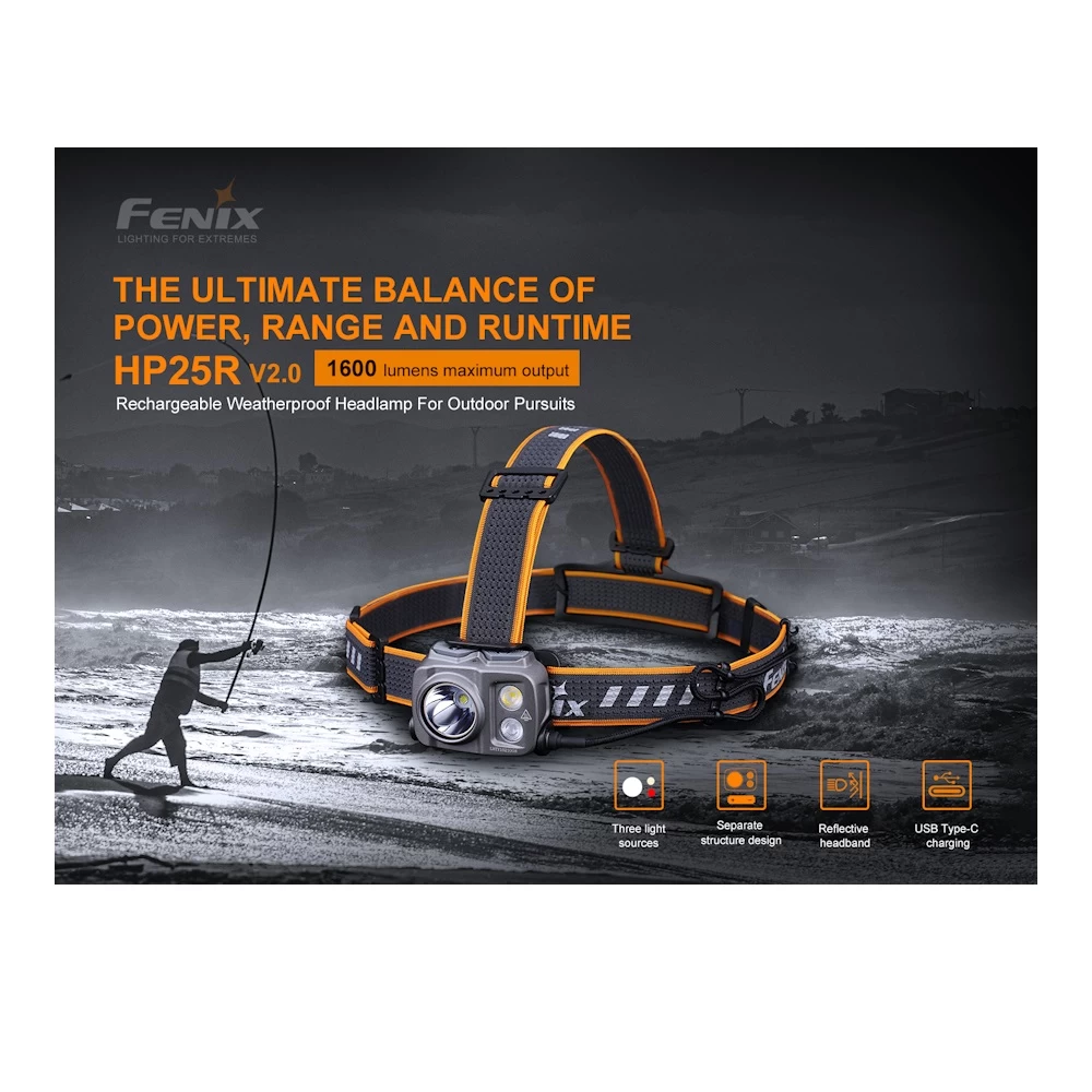 Fenix HP25R V2.0 sits at the pinnacle of the Fenix single lithium battery headlamp range. With a huge 5000 mAh capacity from its rear mounted, replaceable rechargeable battery, combined with precision engineered heat transfer from the LED’s into the cast / precision machined aluminium head unit, this headlamp delivers massive performance in terms of sustained power output at high brightness, plus huge run time at lower brightness levels. Check the run time graph below to see HP25R V2’s measured performance at 21 degrees C.