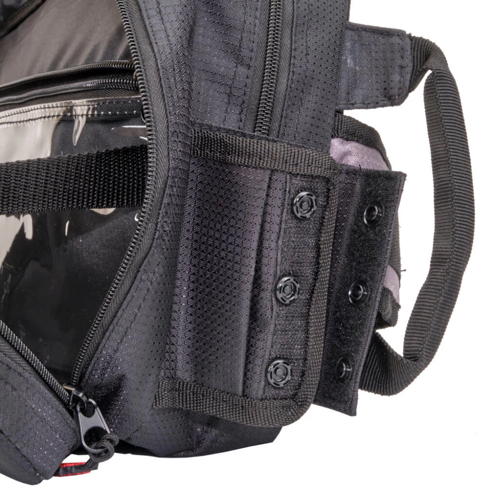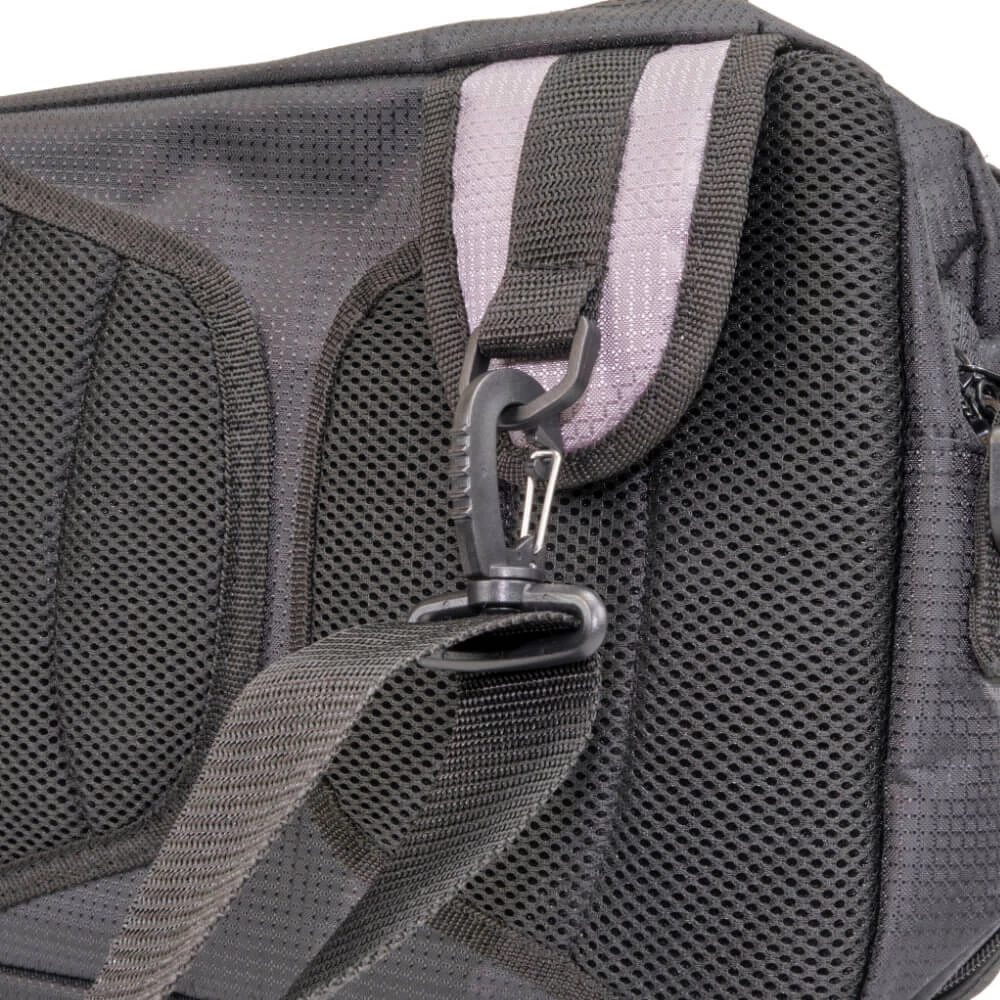 It can be worn like a sling bag over your shoulder. The strap has a spare D ring for attaching tools and has MOLLE style webbing straps for attaching other close to hand items. To the side, there is a fold that can be secured with Velcro and clips, which is ideal for storing a landing net. A handy carry handle makes it easy to pick up when moving short distances without having to put it over your shoulder or around your waist.