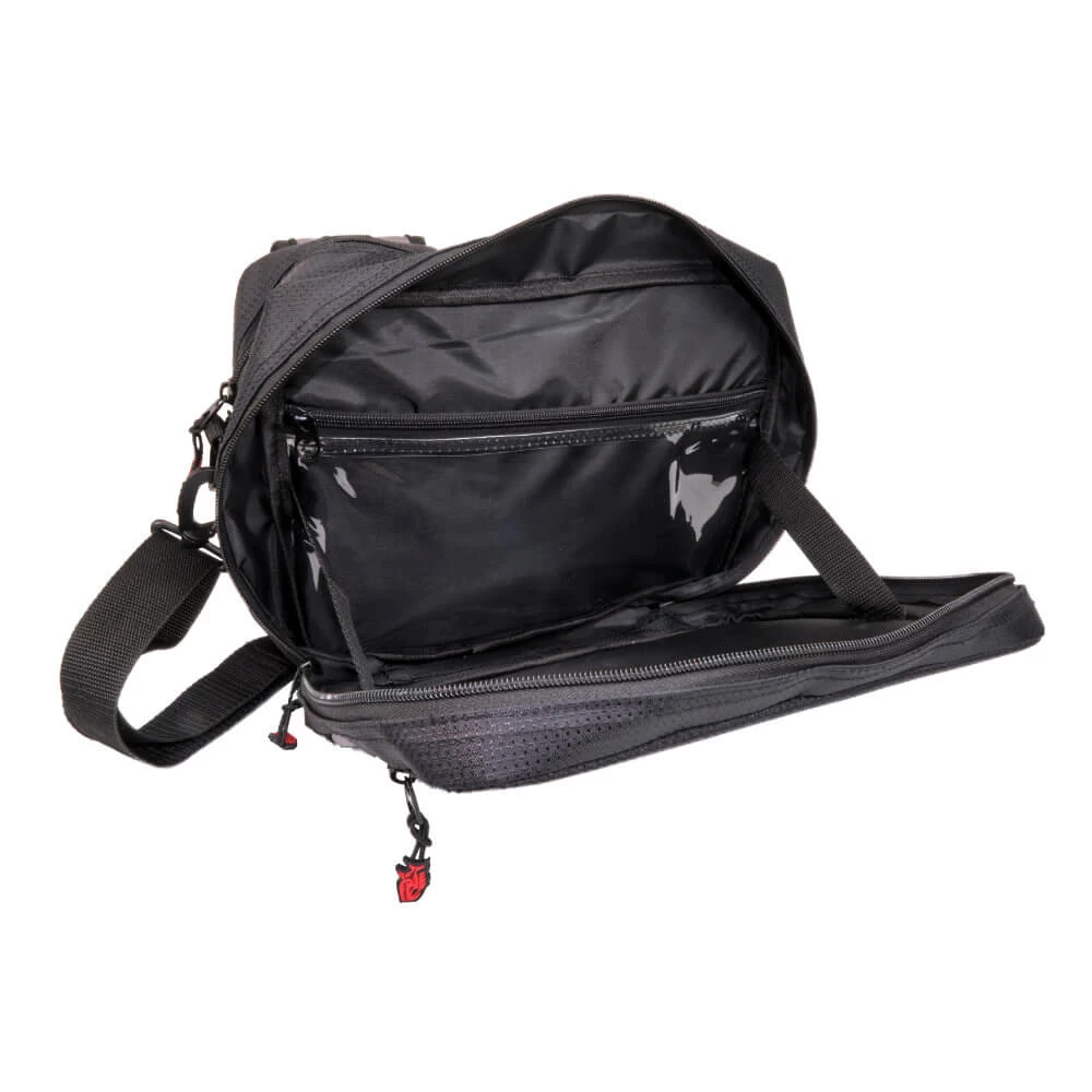 Taking a closer look at the HTO Sling Bag storage, the front of the bag has a full-length zip pouch which is ideal for storing tools, line and other bits of kit. The front section of the bag folds down bench style, giving you a working area with your boxes and tackle on and for quick access to often-used lures and bits and bobs. A clear zipped pouch adds extra storage. The rear compartment is for bigger tackle boxes with another clear, zipped pouch for extra storage.