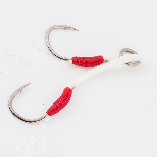 The Seadra A65T Twin Assist is a small but strong double assist hook for fitting on metals or slow jigs. The hooks have a forged bend, curved point and neat barb to ensure good hook ups. They are fitted to short lengths of extra heavy assist cord and both are looped to a strong solid ring. The hooks have added flash for extra movement and attraction.