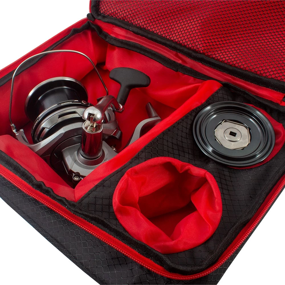 A decent sized reel bag which will hold a full sized surf reel as well as two spare spools. Two separate, padded pockets to the side will carry two spare spools securely. The bag is well padded and there is plenty of separation between the reel and the spools to ensure that neither the reel nor the spare spools will be damaged in transit. The lid has a zipped mesh pocket that runs the full length, ideal for storing extra bits of kit such as shock leader material, spare spool bands and other close to hand reel items. Made from a 420D Oxford Nylon which is water-resistant, wipe clean and tough.