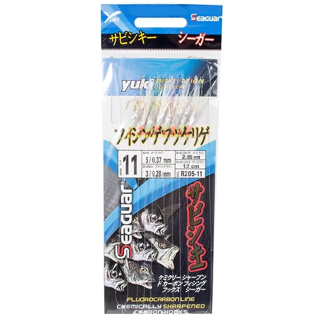 The Yuki R205 is a premium grade sabiki lure which can be used to target a huge range of smaller species. They are expertly tied on chemically sharpened #11 (approx. UK size 6) carbon hooks. Each lure is constructed using a combination of feather, flashabou, fish skin, holo silver foil lumi paint and beads to create the perfect miniature imitation of a small bait fish. The lures are then mounted on Seaguar fluorocarbon line to give you something far more than just another string of feathers. Each trace comprises of 8 lures so you can either fish it as it is or cut down to make two or three smaller sets.